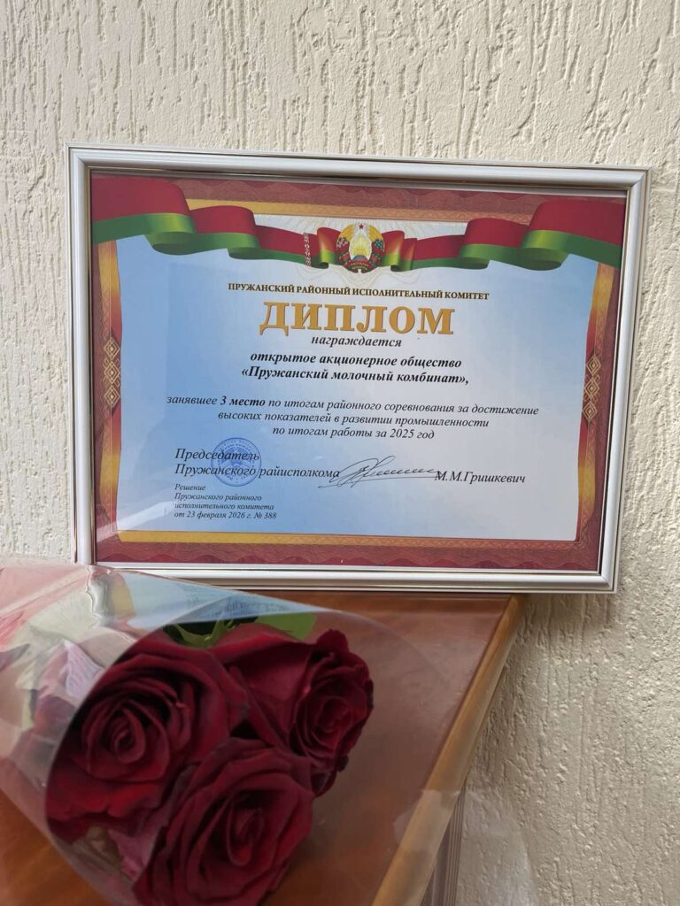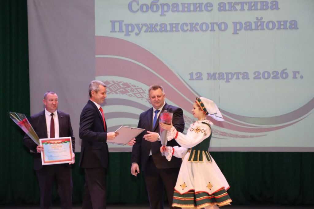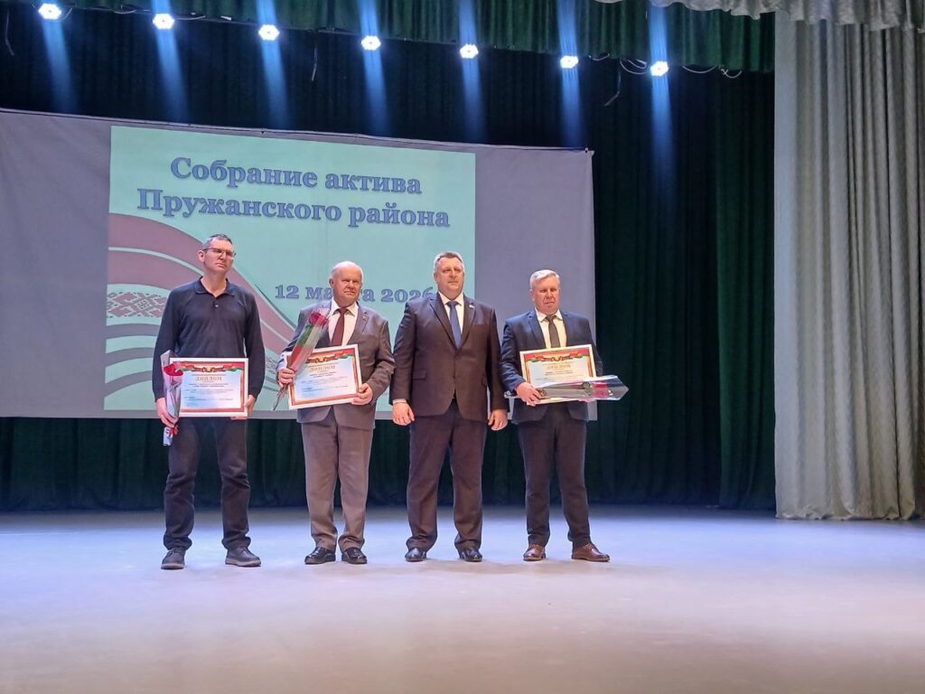 На собрании актива за достижение наивысших результатов в социально-экономическом развитии района в 2025 году награждены лучшие организации, учреждения и предприятия региона. Среди них – ОАО «Пружанский молочный комбинат», занявший 3-е место среди промышленных предприятий района. Почетная награда председателем райисполкома вручена директору предприятия Александру Лосю.